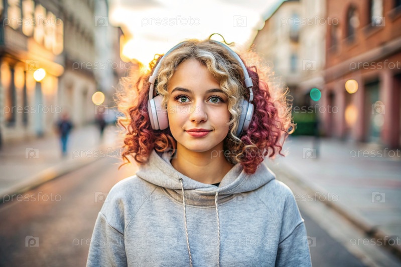 Молодая красивая кудрявая женщина с розовыми волосами слушает музыку на наушниках на вечерней улице города.Мир, гармония, отдых и расслабление