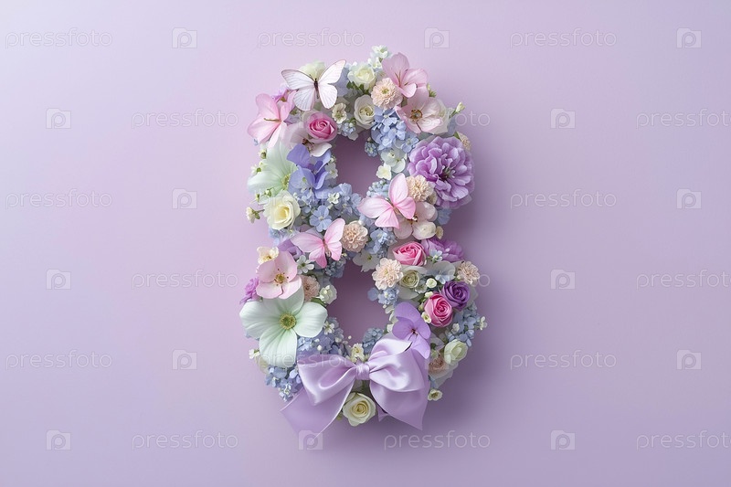 Международный женский день. баннер, флаер, красивая открытка на 8 марта. цветы в форме цифры восемь и бабочки на лиловом фоне