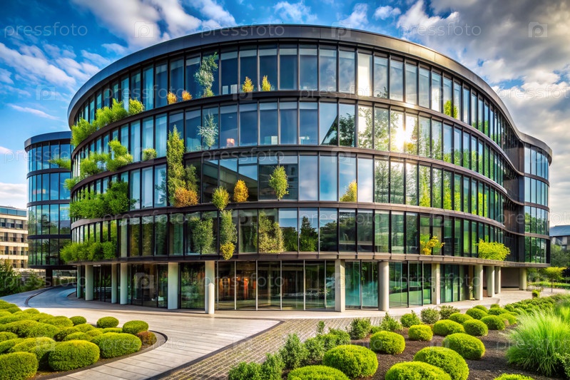Современная городская экология. Снижение выбросов углекислого газа в городе. Экологически чистое стильное здание с посаженными зелеными растениями для нормализации содержания кислорода в воздухе