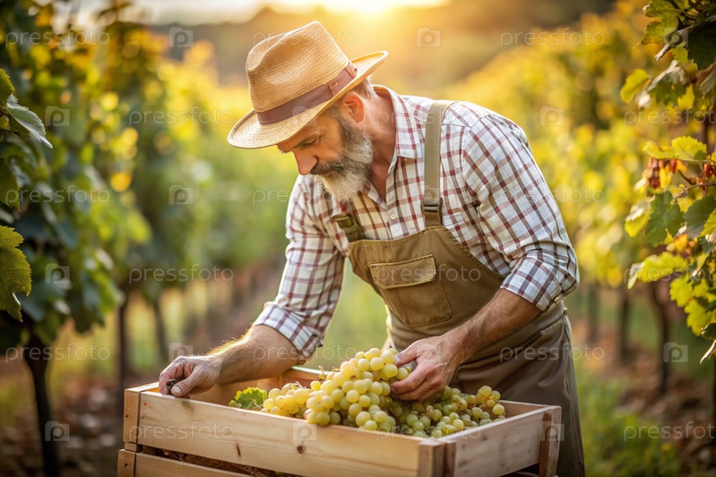 Сельскохозяйственная промышленность. Производство вина. Деревянный ящик с виноградом в руках фермера-мужчины. Садовник собирает богатый урожай. Ближе, солнечный свет. Осенний плодовый сбор