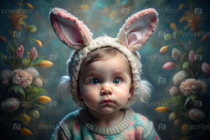 Баннер. Винтажная открытка. Девушка в костюме пасхального кролика с милыми ушами. Концепция праздника Bright Easter Spring