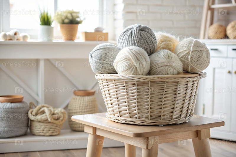 шарики пряжи в корзине из плесеня в белых и бежевых тонах швейная работа, текстиль, вязание зимний сезон, малый бизнес, ручная одежда