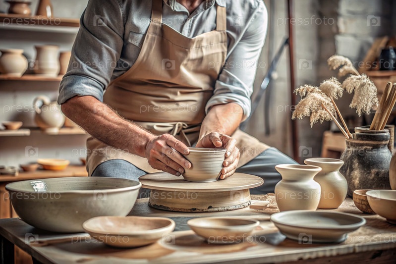 Руки мастера-керамика в керамической мастерской для приготовления пищи Производство глины и керамических посуд. Руки глинаря создают кувшин на колесе