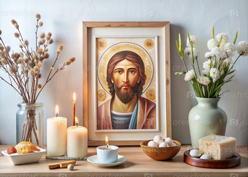 Православный Пасхальный торт, окрашенные яйца, иконы, лица святых, цветы, церковные свечи и пасхальное украшение на деревянном столе в старом деревенском доме