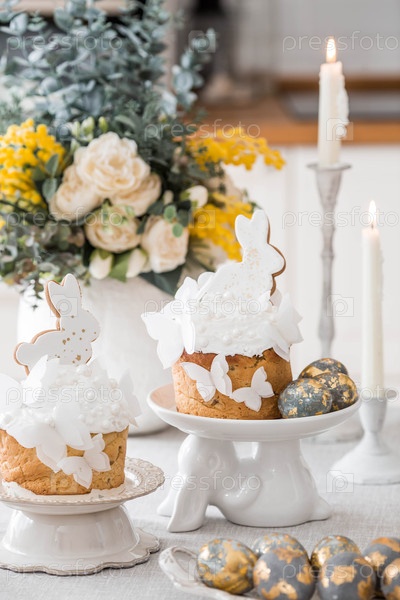Пасхальное блюдо.Счастливая Пасха 2026.Пасхальный торт с белыми зайцами из пряничного хлеба, бабочками из рисовой бумаги, позолоченными пасхальными яйцами, свечами и весенним букетом на светлом фоне