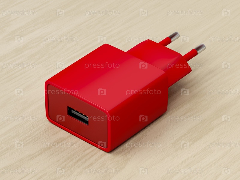Красный адаптер питания на деревянном фоне