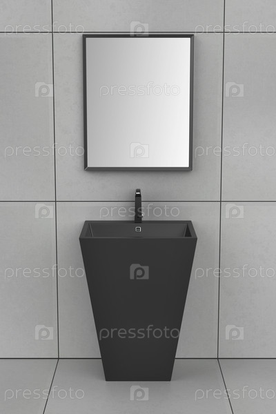 Черный пьедестальный раковина с краном и зеркалом