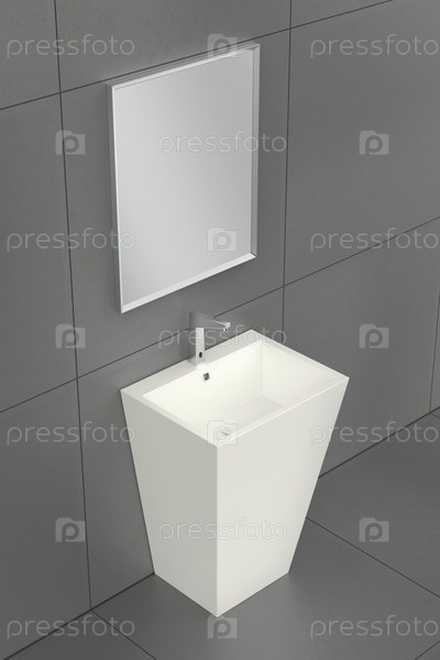 Белый пьедестальный раковина с серебряным краном и зеркалом