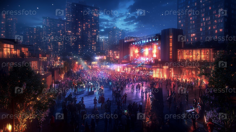 Переполненная городская площадь, освещаемая яркими огнями ночью