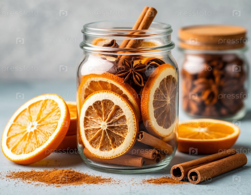 Сушеные нарезы апельсина и корица в стеклянной банке
