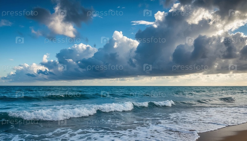 Морской пейзаж с скалистым берегом. драматический шторм, облака