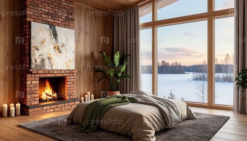Интерьер уютной спальни для романтических выходных Камин, свечи, панорамные окна, коттедж, отель