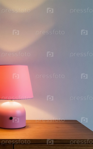 Розовая лампа на деревянной столешнице на фоне минимализма