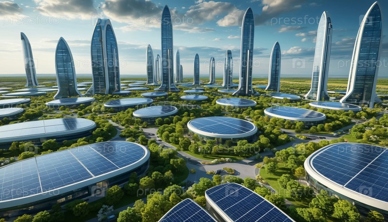 Футуристический город будущего с чистой экологией и зеленой энергией солнечных панелей