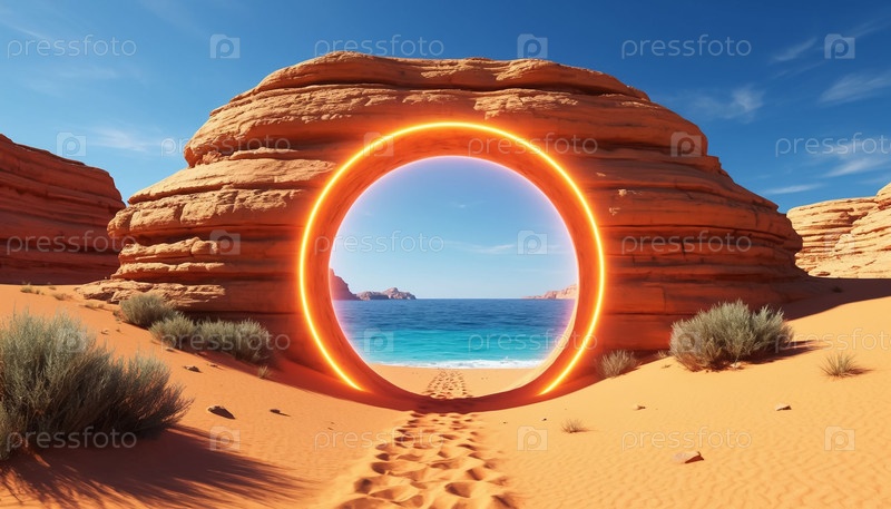 Светящийся портал посреди горячей пустыни, ведущий к океану