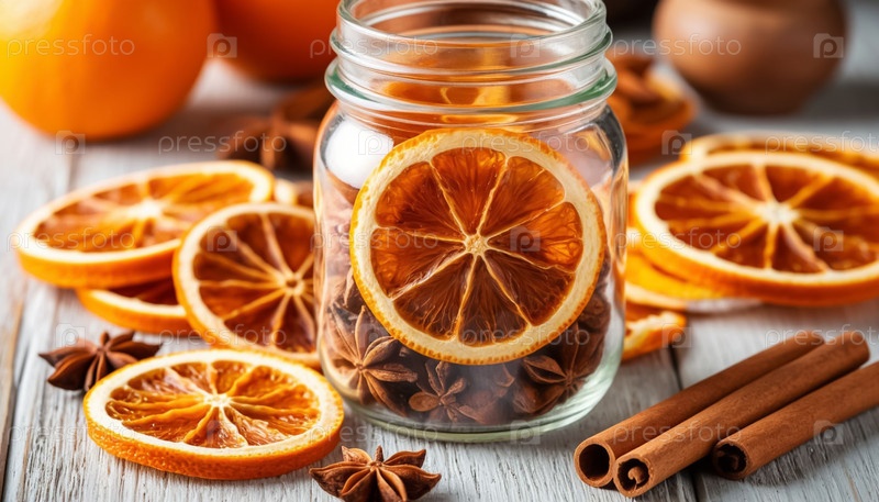 Сушеные нарезы апельсина и корица в стеклянной банке