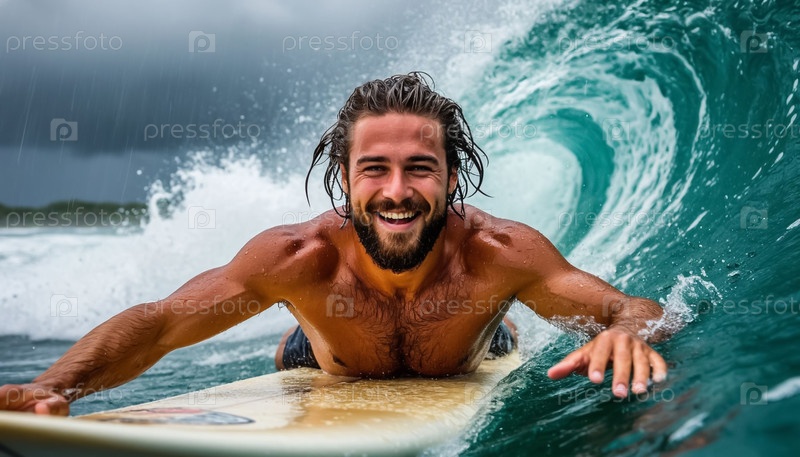Красивый мужчина с бородой во время шторма и грозы в море на доске для серфинга