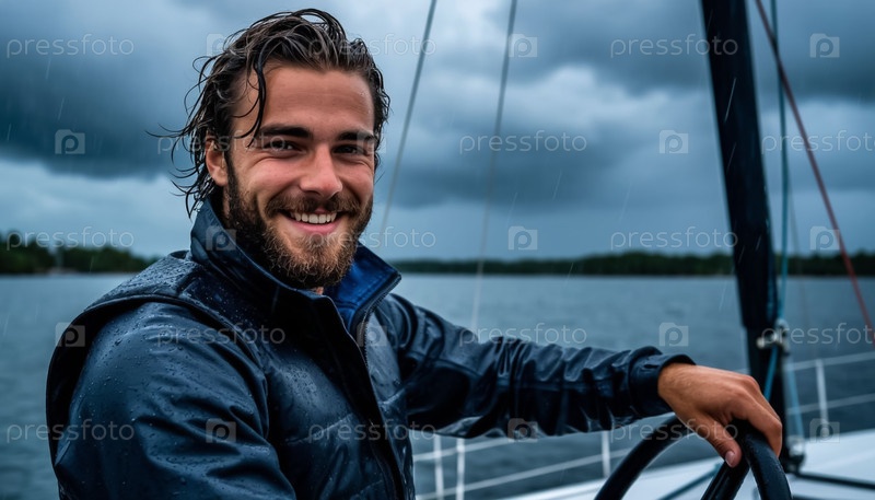Красивый мужчина с бородой управляет яхтой во время шторма, дождя и грозы