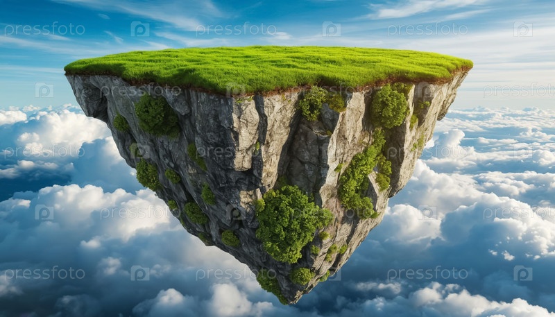 Плавучий кусок скалы с зеленой поверхностью в небе.Сюрреализм