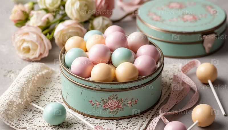 Конфеты в пастельном винтажном металлическом круглом ящике