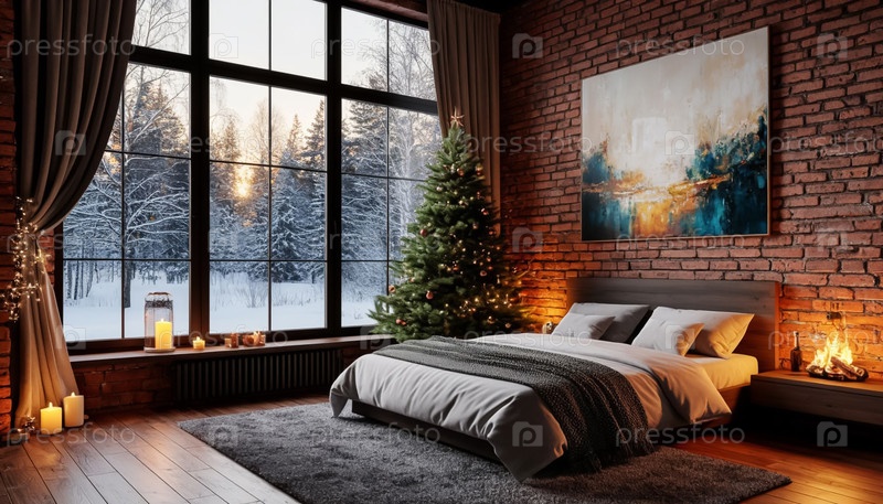 Спальня загородного коттеджа с рождественской елкой, панорамными окнами, камином. гостиница или квартира на выходные. генерация ИИ