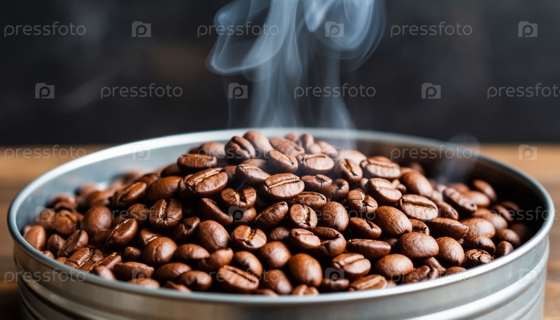 Кофейные бобы в металлической миске с дымом на темном фоне