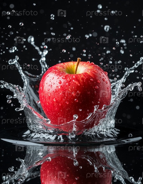 Зрелое яблоко брызгает водой на темном фоне, генерируя AI