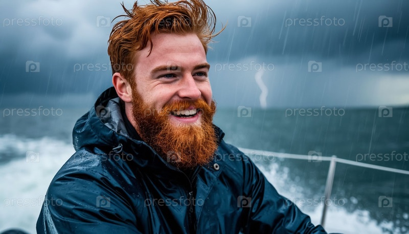 Жестокий краснокожий человек с бородой управляет яхтой во время шторма, дождя, грозы и молнии