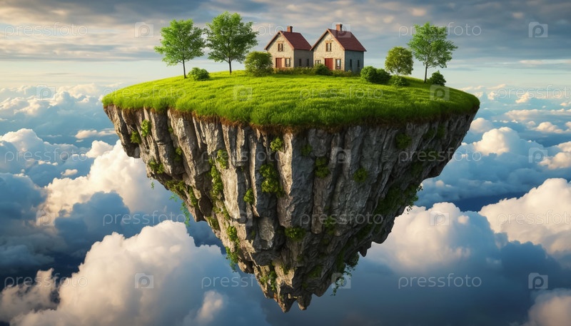 Летающая скала с зеленой травой и домами