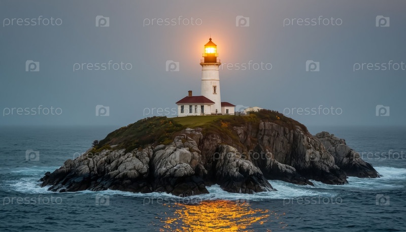 Маяк светит при закате на острове в океане