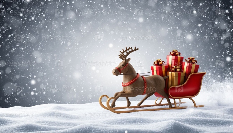 Красные санки с подарками на снежных кусках Новогодний фон Генерация ИИ
