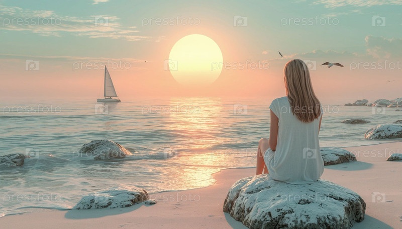 Девушка в белом у моря на рассвете смотрит на парусную лодку