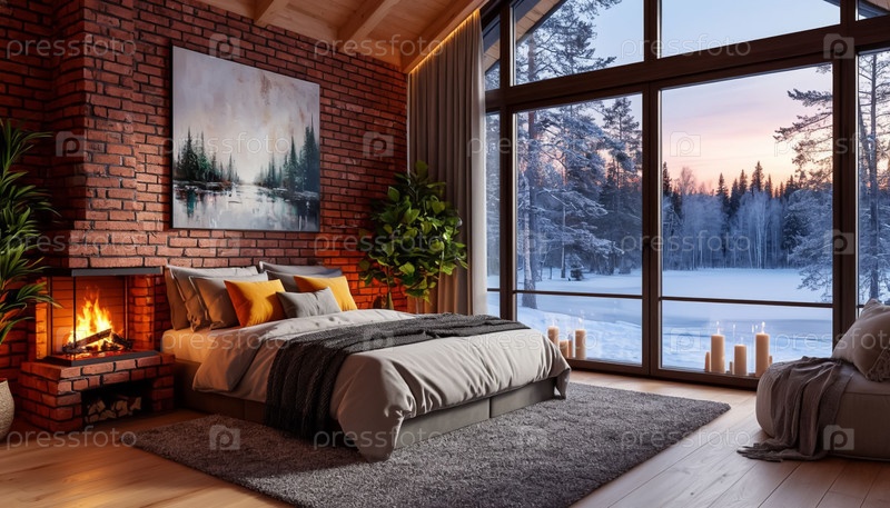 Интерьер спальни в загородном коттедже, скандинавский стиль, панорамные окна, зима