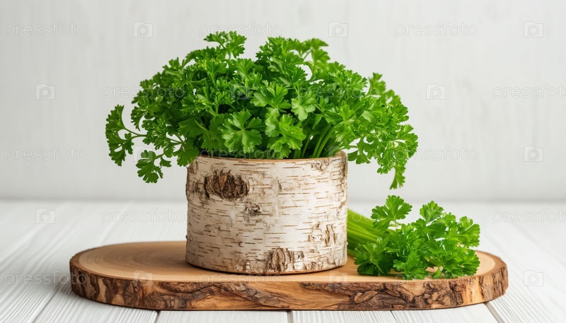 Зеленые петрушки в цилиндрической трубке из березовой коры