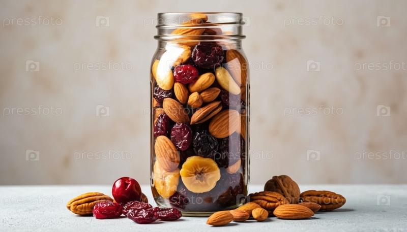 Сухофрукты и орехи в стеклянной банке