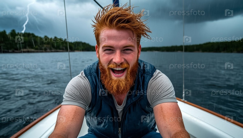 Жестокий краснокожий человек с бородой управляет яхтой во время шторма, дождя, грозы и молнии