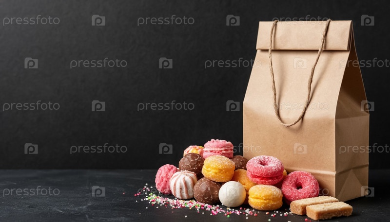 Бумажный пакет с конфетами на черном фоне
