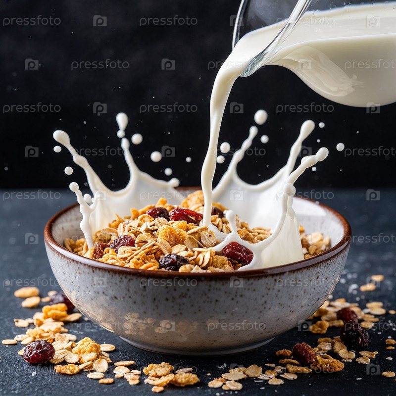 Молоко наливается в миску мюсли