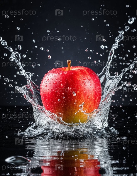 Зрелое яблоко брызгает водой на темном фоне, генерируя AI
