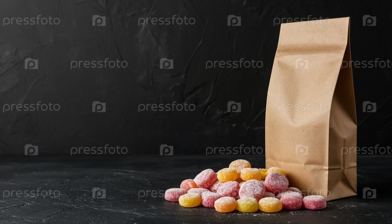 Бумажный пакет с конфетами на черном фоне