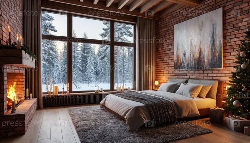 Спальня загородного коттеджа с рождественской елкой, панорамными окнами, камином. гостиница или квартира на выходные. генерация ИИ