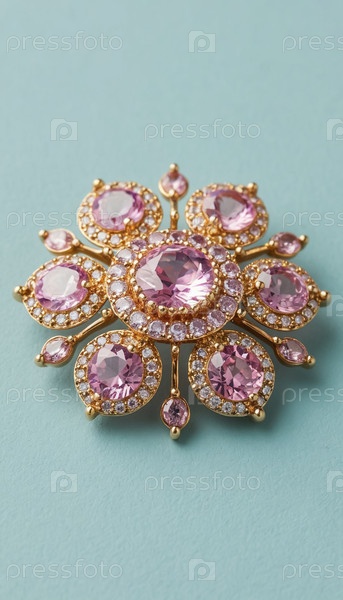 Золотая брошка с камнями на минималистическом пастельно-синем фоне, пространство для копировки