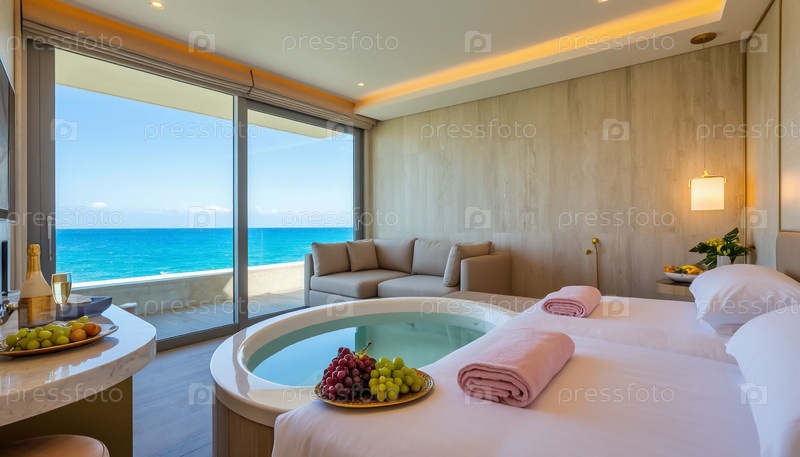 Интерьер ванной комнаты с панорамным окном и круглым джакузи, видом на море, отель