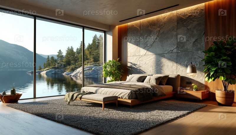 Высокотехнологичный интерьер спальни с панорамными окнами и видом на горы и море