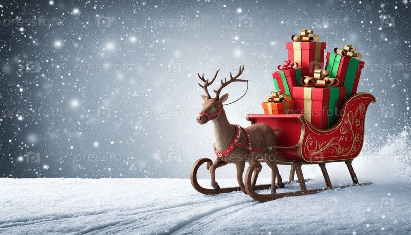 Красные санки с подарками на снежных кусках Новогодний фон Генерация ИИ