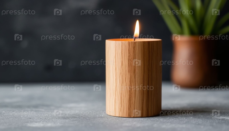Декоративная свеча на столе в деревянной подставке
