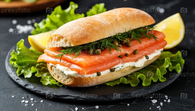Сэндвич с красной рыбой на темном фоне