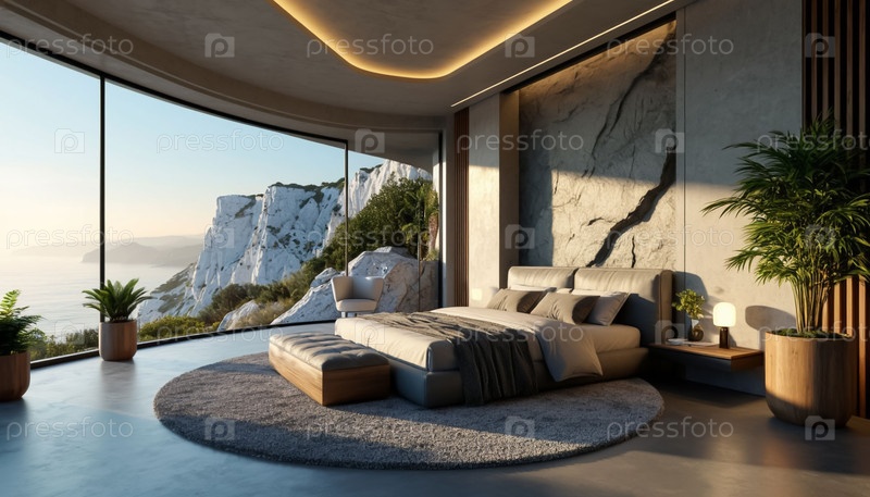 Высокотехнологичный интерьер спальни с панорамными окнами и видом на горы и море