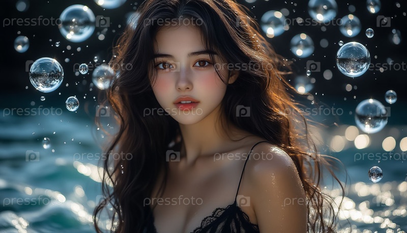 Азиатская девушка в воде среди пузырей Эфирный подводный портрет