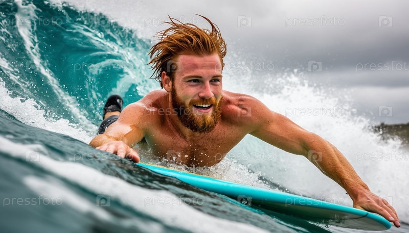 Красивый краснокожий мужчина с бородой в море на доске для серфинга в пасмурную погоду